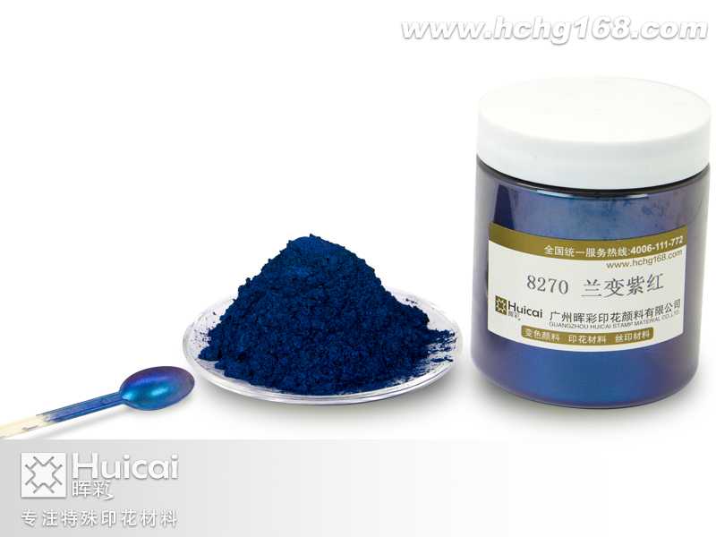 8270蘭變紫紅變色龍粉其變色原理為吸收特定波長之紫外光源,藉由該光源之能量而產生顏色變化(變為紫色、紅色、黃色、天空蘭色),當特定波長的紫外光源不在時,即恢復原來的顏色。