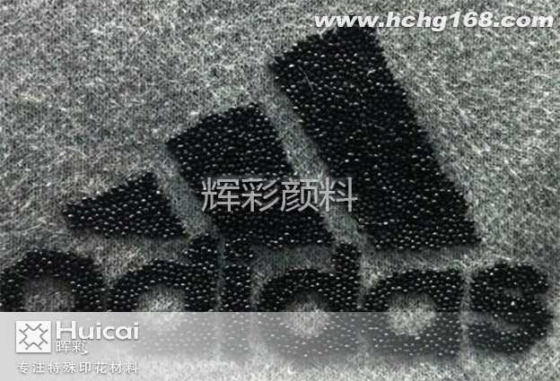 先印輝彩印花材料的HC-800粘珠漿一次吹干打底,然后再印第二次時以膠珠的大小來確定印粘珠漿的厚度,或是印第三次粘珠漿以便留有足夠的粘珠漿