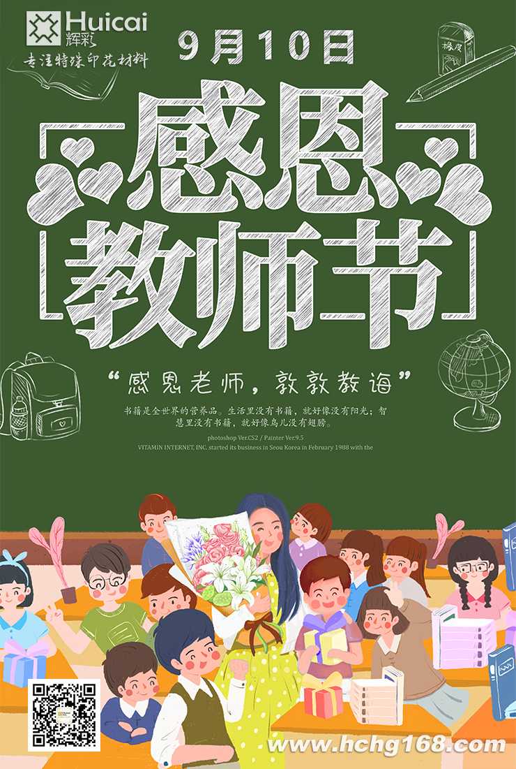 一支粉筆,兩袖微塵,三尺講臺,四季耕耘,這是教師的真實寫照。教師是辛勤的園丁,培育者祖國的花朵,“春蠶到死絲方盡,蠟炬成灰淚始干,”這是形容教師的高尚品德。在第37個教師節來臨之際,輝彩印花材料廠家攜全體員工祝老師們教師節快樂。