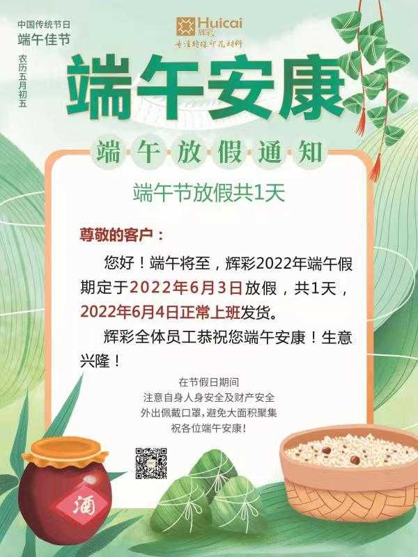 端午節是我國的傳統節日,為每年農歷五月初五,根據國務院辦公廳關于端午節放假通知,并結合我司實際情況,廣州輝彩印花材料有限公司2022年端午節放假時間為6月3日(星期五),6月4號(星期六)正常上班。