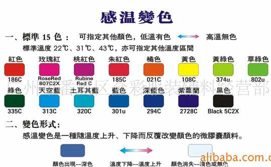 4、感溫變色內含微膠囊變色顆粒,粒徑在1~10UM之間,并具有耐高溫、抗氧化等膠囊所改變的特性。