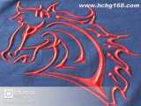 3、立體圓角:采用立體嗜哩油墨,要用厚版感光膠制厚版印刷,第一遍要用力印以保證油墨滲入面料纖維內,第二遍以后要保證用力均勻,正好讓油墨剝離于網版,這樣的圓角表面光潔,牢度好。一般可用網目為80—120目、刮刀要較軟、60度左右。