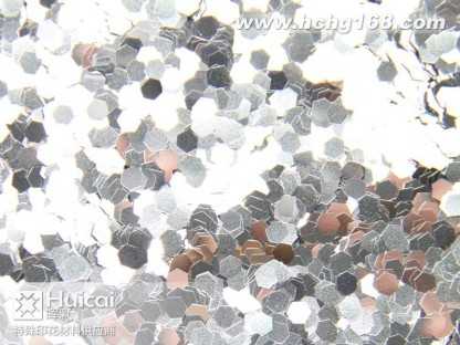 金蔥粉:又名閃光片。包括鋁質金蔥粉,聚酯金蔥粉,幻彩粉,鐳射金蔥粉等。有鋁質,PET,PVC材質。大小規格(size)由1/256(0、1mm)至1/8(3、0mm)。形狀有六角形,四角形,長條針形和不規則形狀,并有多種顏色可供選擇。各種材質金蔥粉可不同程度承受高溫(由80*C,180*C,300*C不等) 。